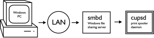 Samba uses nmbd and smbd daemons to share files and printers with Windows PCs. nmbd acts as a Windows naming service, broadcasting your computer's name to Windows PCs on the LAN. smbd accepts file and printer requests from Windows PCs Figure 3.