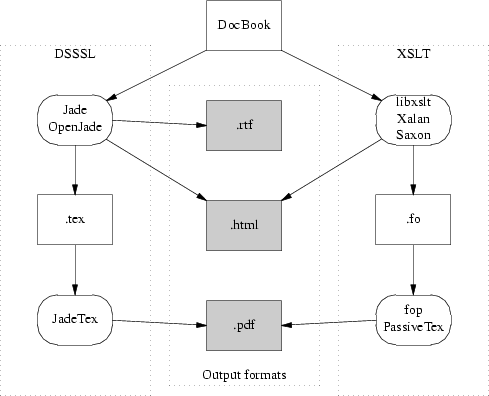 The DSSSL toolchain is what processed DocBook SGML. Under it, a document goes from DocBook format through one of two closely-related stylesheet engines called Jade and OpenJade. These turn it into a TeX-macro markup, which is processed by a package called JadeTeX, into DVIs, which then get turned into Postscript.