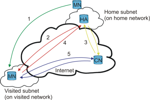 5. When the MN answers the CN, it may use its current care-of-address (and perform a binding to the CN) and communicate with the CN directly (optimized routing) or it can tunnel all its packets through the HA.