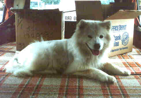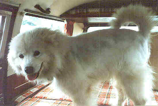 Suzie is totally white (don't let shadows in the pictures fool you) with long hair except along the back where it is growing out after being shaved a while back, and she wears a collar with a rabies tag from a vet in Shelton. Suzie is a very friendly Samoyed, and became lost while visiting in Seattle.