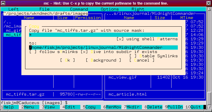 As I mentioned above, time has been a bit short here recently although over a short Fall Break a couple weeks ago I did manage to write up a short article for the Linux Journal on the Midnight Commander file manager. They have very graciously allowed me to include the full text of this here. This is the unedited, first-draft copy that was sent to them, so all the typos and other egregiosities are solely mine. I have long wanted to write about this fantastic file manager which, in my book, is a definite "must have" app on every Linux system. This is geared towards an introduction/overview, and while admittedly not encyclopedic, it does cover most of the highlights (I think... :-) Here it is: