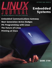 The October issue of Linux Journal will be hitting the newsstands September 11. The focus of this issue is Embedded Systems and we have feature articles on Active Badges, Communications Gateways and PIC Programming. Also included are a review of the Cobalt Cube, a Virginia Power update and an interview with Robert Dinse of Eskimo North. Check out the Table of Contents at http://www.linuxjournal.com/issue54/index.html. To subscribe to Linux Journal, go to http://www.linuxjournal.com/ljsubsorder.html.