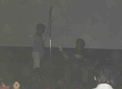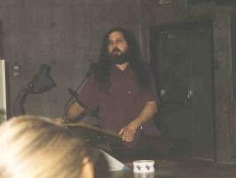 Finally we catch our first glimpse of Stallman. He looks a lot less imposing than I'd imagined him. (In my mind I'd pictured an immense being with limbs like redwoods and a voice like thunder.) Despite his reputation, I find later that he's surprisingly easy to talk to and generally quite gracious, especially to people asking very basic questions about GNU. He's constantly fiddling with his hair when he's answering a question (looks like he's checking for loose ends) but as long as you have something interesting to say, you have his full attention.