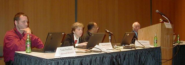 The left side of the Open Source panel discussion. Todd Needham from Microsoft is on the left, Susan Grahm of UC Berkeley is next to him, and Jose Munoz, my DOE buddy, is next to Susan looking to his left. The guy behind the podium is Robert Brochers of NSF. The guy from Sandia National Lab is not shown.
