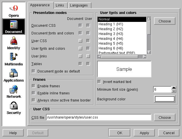 You can customize the look'n'feel of Opera to the extend. Much more than Netscape. Display of documents is controlled by CSS. You may either use one from a web site on the net or supply your own. You can select a whole file to do this or you can customize color, font and size of the various objects as headers, paragraphs, etc.