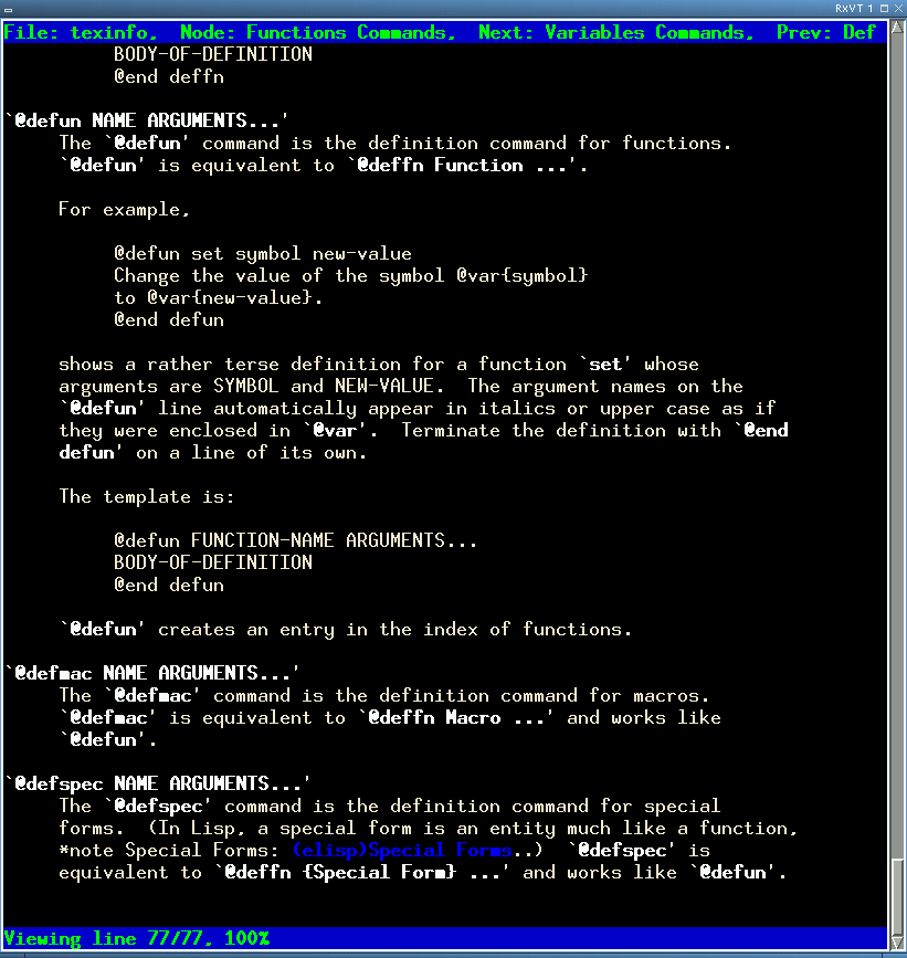 Texinfo differs from all the document preparation systems that we have had a look at so far, for Texinfo can be translated in an online viewing format different from HTML, namely: Info. Having an online viewing format, we need browsers to actually view it!