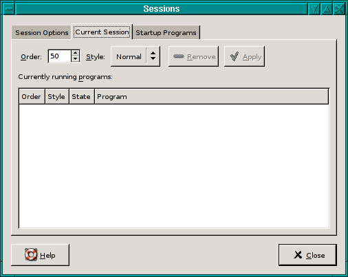 Then, going back to the session-properties window, select the window manager which is running (sawfish or metacity), and clicking on the 'Style' button set the active state to Normal. You must then click on 'Apply'. What this has done is to ensure that when the session restarts the window manager that was previously loaded isn't. Then in an xterm type: