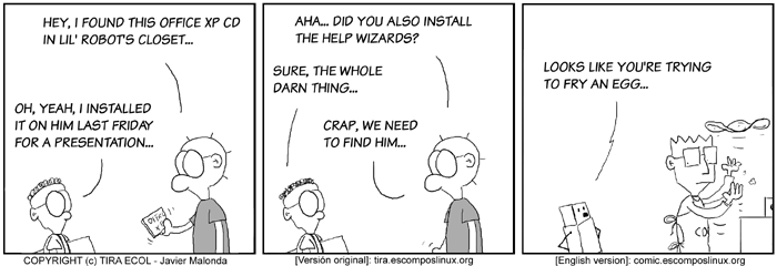 The Ecol comic strip is written for escomposlinux.org (ECOL), the web site that supports es.comp.os.linux, the Spanish USENET newsgroup for Linux. The strips are drawn in Spanish and then translated to English by the author.