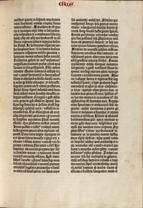 This page from the first edition of the Gutenberg bible, printed in 1454, shows the rigidity of the grid produced by moveable type, and the resultant use of hyphens to compensate for the consistant word spacing. There are over 30 hyphens on this page, including several strings of four or more in a row; this would never be acceptable in typesetting today. However, the ability to easily word-space (change the space between words within a single line) would require the invention of the Linotype in 1886.