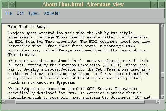 For several years a group of programmers in France have been developing an elaborate text-processing system known as Thot. Thot has some resemblances to Tex, in that it is a structural document-editing system capable of very high-quality output. One major difference is that Thot is more WYSIWYG; the formatting tagging is hidden and doesn't have to be explicitly written by the user. The output formats are more varied as well. Thot can produce Postscript files, as Tex can, but it can also produce plain ASCII text and HTML. This last formatting capability attracted the attention of the W3 Consortium a couple of years ago. (W3 is an international research organization which attempts to set standards for Internet documents; their flexibility and patience have been sorely tried in recent years by the flood of HTML innovations introduced by Microsoft and Netscape, among others). Using the Thot system as a core, the W3 group in collaboration with the Thot developers have been developing a combined web-browser and HTML editor known as Amaya.
