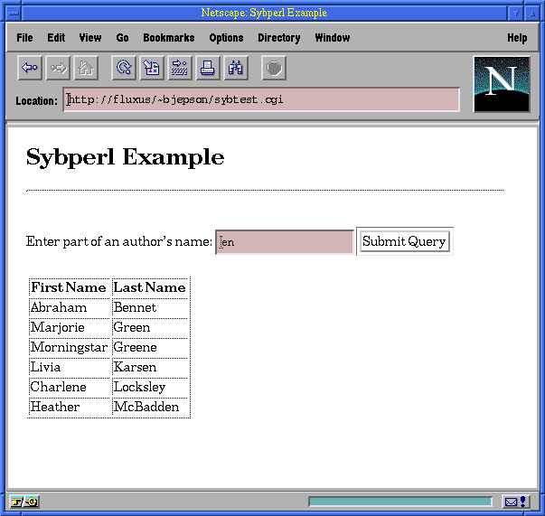 Here's a sample Perl program that uses CGI and Sybase::CTlib to give the users the ability to interactively query the authors table that is included with the pubs sample database: