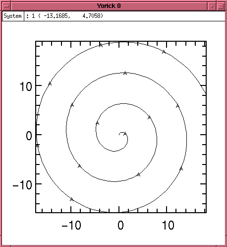 The result is shown in Plot 1. Note that the arguments are supplied y,x (not x,y). This allows Yorick to supply a default x vector (ranging from 1 to the number of y points) if desired.