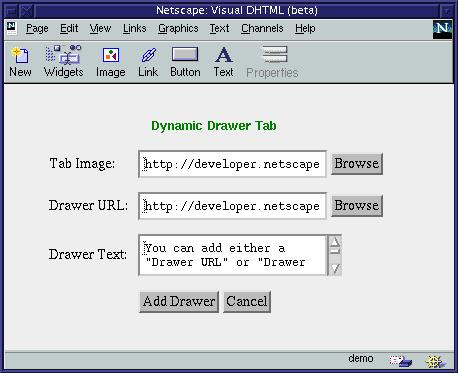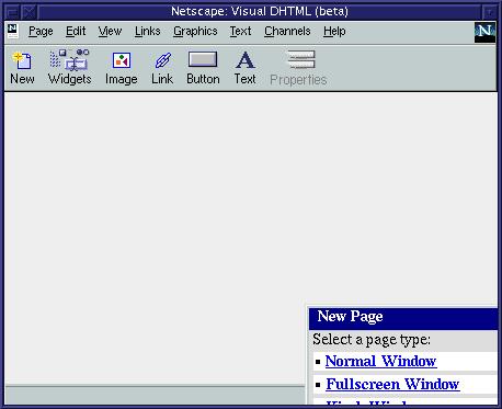 The only prerequsite for running VDHTML is that you have a browser that supports JavaScript 1.2. That fairly well eliminates all browsers except Netscape Communicator 4.06 or the latest 4.5 beta releases of Communicator. If you don't have one of these, you may want to skip the rest of this article. Also, although you are supposed to be able to run this on your local system, attempting to run the application without being connected to the Net or by using local URL's seemed to cause unexpected behaviours: drag and drop no longer worked, widgets did not become visible in the preview window, etc. I suggest, during your experimentation, that you only run this early version while connected to the Net, if possible.