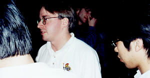 A question came up about GUIs. He as no interest in GUI design or interfaces, and has no influence in current GUI theological discussions ongoing right now. (My guess is that this refers to GNOME vs. KDE type of theoretical friction.) He is happy using fvwm2 and his 15 xterms to apply patches to the kernel and rebuild it again and again.