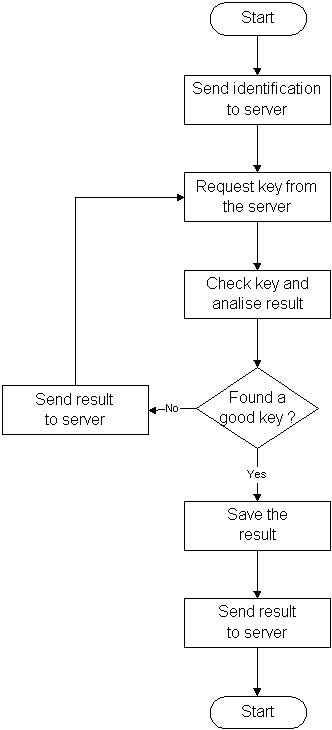 Basically, the main functionality of the client software is to test all the possible keys distributed by the key server and then analyse the result and test if the key is the right key or not.