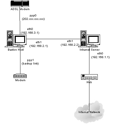 OK I subscribed to the broadband service finally. It takes two weeks to arrange a technical guy to install the splitter and ADSL modem. Actually I can do it myself but they don't want me to. Anyway this is a good time to build the network and prepair for the high speed connection. Before actually building the network, it is better to think about the topology first. I make use of my spare old hardware and spent some money to build two linux box. One linux box will be the baston host running Apache web server, ftp server, email server and MySQL database server. The baston host will act as an exterior router routing traffic between the internet and the intranet. The other linux box will be the Intranet server hosting internal application and data. The intranet box will act as an interior router. Someone asked, why two linux box? Well, for security reason of course. Please refer to your technical books about firewalling for details explaination. Figure 1 shows the network diagram of my home network.