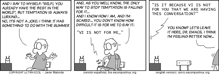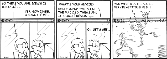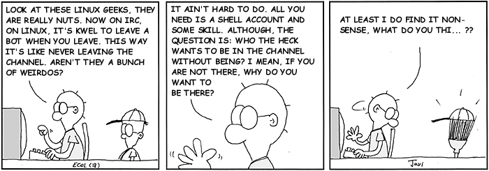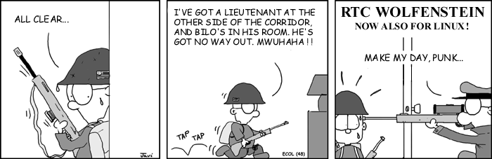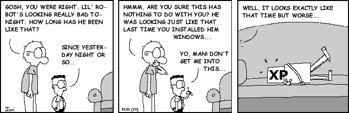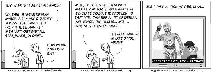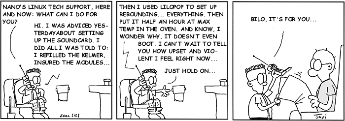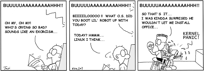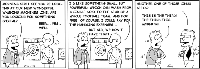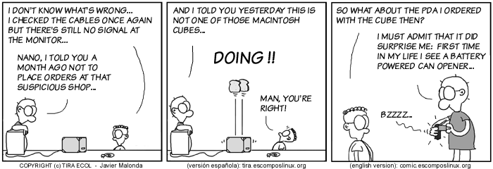 Hi. I am a member of escomposlinux.org, an organization supporting the es.comp.os.linux.* newsgroups. Some years ago, a fellow member had the wonderful idea of drawing a weekly comic strip based on linux.Here are a few of the best cartoons since the comic started in January 2001.Well, recently, the strip has been translated into English (ajem, we are doing our best ;-)