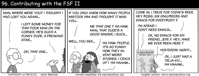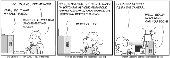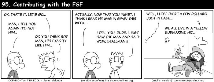 The Ecol comic strip is written for escomposlinux.org (ECOL), the web site that supports, es.comp.os.linux, the Spanish USENET newsgroup for Linux. The strips are drawn in Spanish and then translated to English by the author. Text commentary on this page is by LG Editor Iron. Your browser has shrunk the images to conform to the horizontal size limit for LG articles. For better picture quality, click on each cartoon to see it full size.