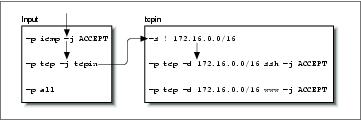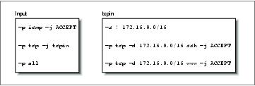 ipchains -P input DENY ipchains -N tcpin ipchains -A tcpin -s ! 172.16.0.0/16 ipchains -A tcpin -p tcp -d 172.16.0.0/16 ssh -j ACCEPT ipchains -A tcpin -p tcp -d 172.16.0.0/16 www -j ACCEPT ipchains -A input -p tcp -j tcpin ipchains -A input -p all |