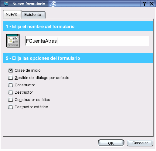 En el diálogo posterior le indicamos el nombre del formulario, en este caso FCuentaAtras, con todos los valores por defecto.