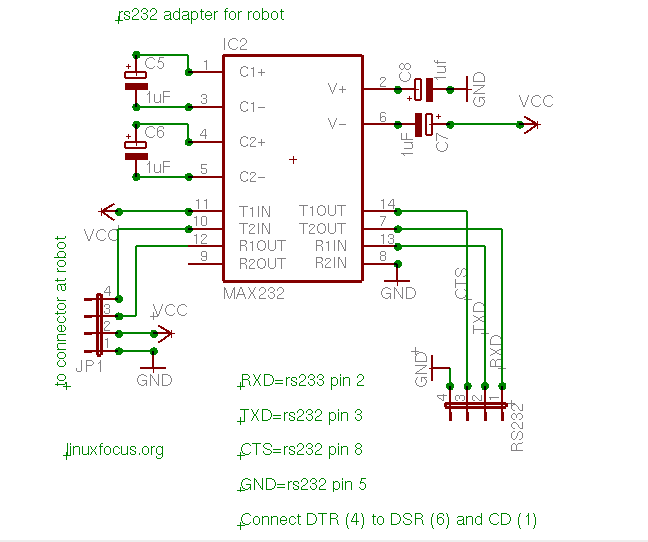 Now the circuit for our autonomous robot would be ready. However what do you do if the robot does not work as expected because something is going wrong in the software? You can't see anything. You don't know what the values of the light sensors are, you don't know why the robot software has taken this or that decision. What we need is some kind of output screen or display to understand what the robot does. The RS232 serial line is well suited for this purpose. We can print values of variables and we could even communicate with the robot. We don't want to connect it all the time but we need it to debug the robot. It therefore makes sense to put the max232 and other parts needed for the RS232 connection onto a separate board and connect it only when needed: