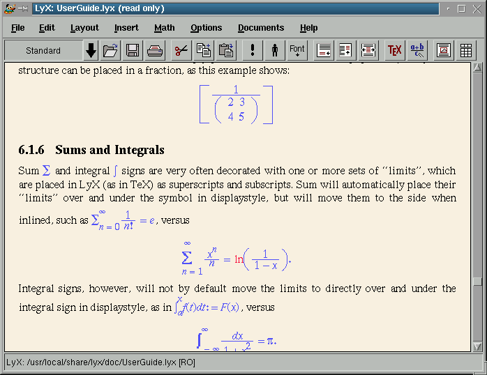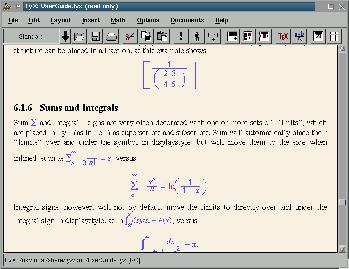 And now the best of all: the mathematics. What I'm going to say is not an exaggeration, there will never be such a simple and intuitive way to write equations and with so impressive printed result. This capability of LyX will be appreciated. Usually, other editors can cope with somewhat complex mathematical expressions... Now try LyX, take your time, and think of a mathematical expression that goes beyond reality: plenty of subindexes, integrals, fractions, irrationals numbers, arrows, braces, arrays, etc. And now print it... and enjoy it!. If you know LaTeX then you can write the expressions the same way you used to do, and LyX will display it on-the-fly!