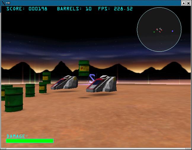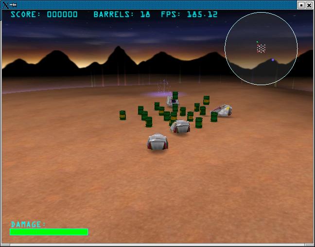 Though today games like Return to Castle Wolfenstein are state of the art and Barrel Patrol 3D can't stand a comparison with them, graphics are really neat and maybe one of the best inside the Linux gaming scene. The bounding forcefield is animated with moving light reflections, tanks and barrels are nicely modeled and textured. The background showing a dark mountain scene creates a really nice surrealistic atmosphere (hey, stealing barrels with a futuristic tank from a forcefield bounded arena is a quite surrealistic setting, isn't it?). Barrels being beamed into the arena at the beginning of each level and being beamed up after the enemy took them outside the forcefield is as well animated as the appearance of add-ons and exploding vehicles. Each action and event is accompanied with particular sound effects. The game comes with sound effects only, there is no music played in the background. The framerate which is displayed in the upper right corner is quite high on an Athlon Thunderbird 1.4 Ghz and a GForce 2 MX. Really, it is quite high, so even on older machines with an 3d graphics accelerator which is not state of the art, this game should run fast and smooth enough to have a lot of fun playing it.