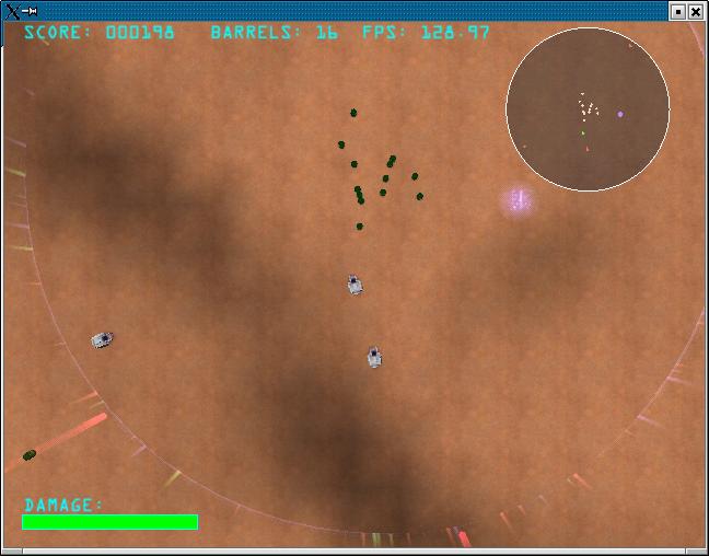 The game consists of several levels, with a fixed number of barrels and enemies. After all enemies have been destroyed you proceed to the next level. After each level you get points for all barrels remaining inside the arena. From level to level the game becomes more difficult, the enemy aims better and remaining in one place from which you shoot at those tanks will surely result in being hit. One hit is enough to destroy an enemy tank. Your vehicle on the other hand is a little bit tougher and can take more damage. If you have been hit too often, your tank explodes. However, the only consequence of this is, that you lose all your add-ons and some kind of time penalty (a few seconds), in which you have to watch those other tanks moving around and maybe taking barrels away without you stopping them. There is no level restart or any "life" taken away every time your tank was shot into pieces. Collecting add-ons improves your firepower, for example your missiles fly faster, let them rebound off the forcefield or gives you homing missiles. Do not forget, same applies for the enemy! Besides the gameview itself, your actual scoring, the number of remaining barrels, a radar screen and a damage indicator are displayed.