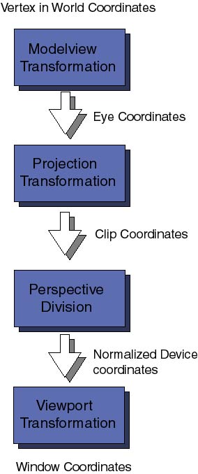 First comes the Modelview coordinate transformations. They map the original world coordinates into eye coordinates, these are 3D coordinates relative to the position of the viewer eye (or camera). It is called Modelview transformation because it really involves many similar though distinct operations. Modeling and Viewing projections , the latter is analogous to the positioning of a photo-camera in a studio looking toward the scene to be photograph; the modeling projection is then similar to the positioning of the objects of interest in front of the camera.