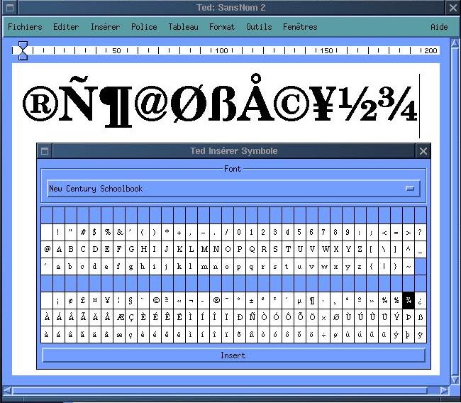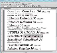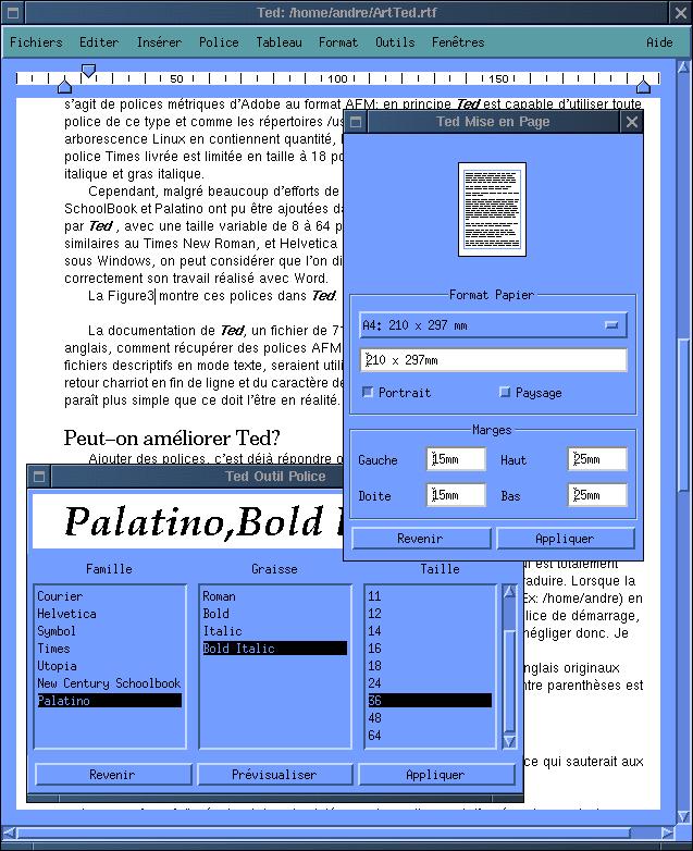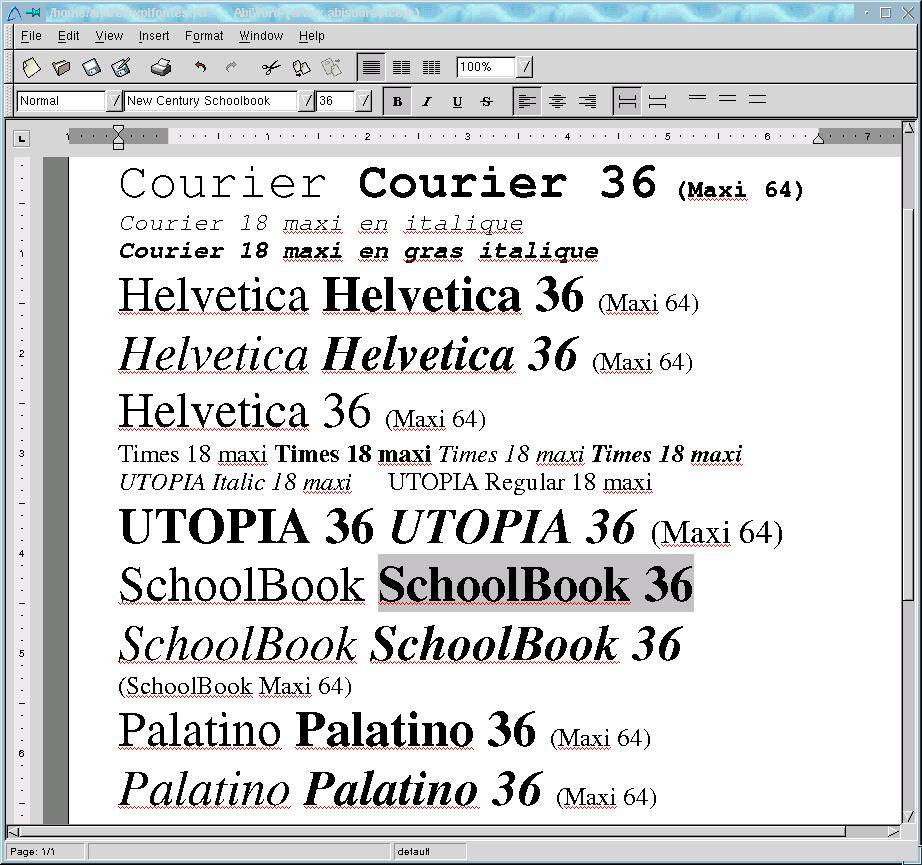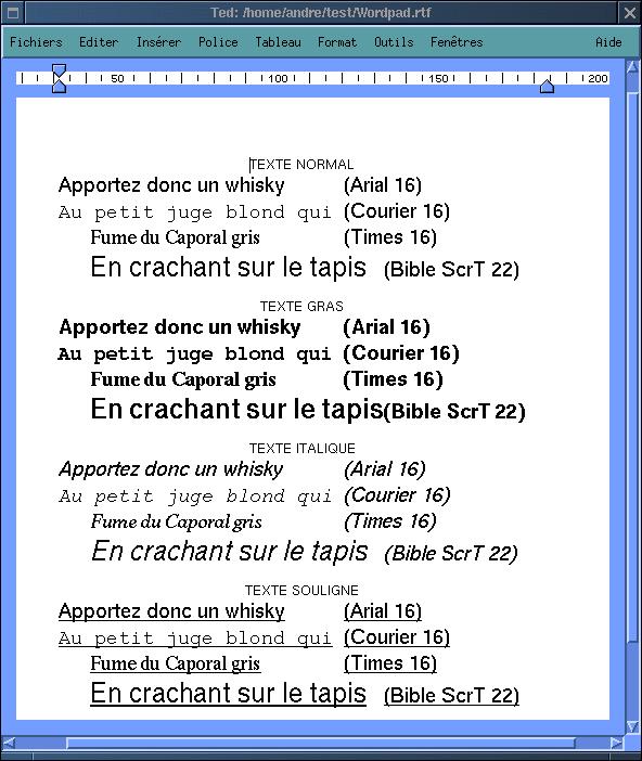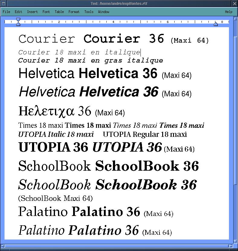 After installation Ted has 4 fonts Times, Helvetica, Courier and Symbol. These are metric fonts from Adobe, available in AFM format. In principle Ted can use any font of this type. The Linux-filesystem tree contains in /usr/share/enscript and /usr/share/ghostscript a lot of these fonts, and the temptation to use them is big especially since the size of the Times font that comes with Ted is limited to 18 points. Just as the Courier italic and the Courier bold-italic fonts.