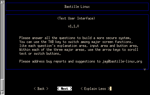 Previous versions of Bastille-Linux only worked on new systems this is not true for the latest one. However, we must say what Bastille does is useless (almost) if your system has already been used. Thus, it's recommended, for security reason and not because of the software, to install Bastille-Linux on a new system (freshly installed). You've been warned, so let's go to the serious side: the installation!