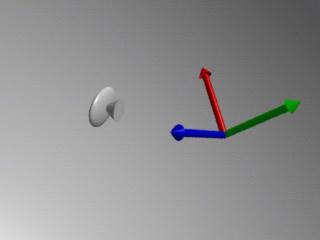 O sistema de coordenadas da câmara é "left-handed" e conincide com a superfície do monitor. A origem se situa no centro da tela com o eixo x até a direita, e o eixo y acima e o z "dentro". Por default, o "sistema de coordenadas atual" conincide com o sistema de coordenadas da câmara" tal como vemos na primeira figura ( o eixo x é vermelho, o y é verde e o z azul). A primeira imagem é uma vista aérea de como vai ficar a cena e a segunda é a cena propriamente dita (as luzes não estão no mesmo lugar das imagens para que se vejam bem). ainda que a cena não seja especialmente complexa (a verdade é bastante horrível) nos servirá para compreender os arquivos RIB do exemplo sem que dificultem os complicados modelos geométricos.